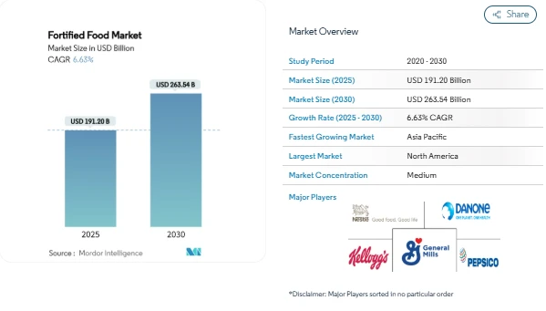 The Fortified Food Market continues to gain attention as consumers increasingly connect everyday eating habits with long-term health. According to industry analysis, the market was valued at USD 191.20 billion in 2025 and is projected to reach USD 263.54 billion by 2030, supported by growing interest in preventive nutrition and improved food labeling standards. The Fortified Food Market Forecast reflects steady expansion as more households adopt products enriched with vitamins, minerals, and functional nutrients.