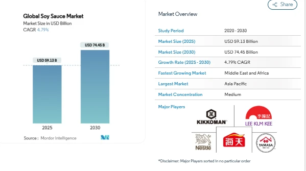 The Soy Sauce Market Size was valued at USD 59.13 billion in 2025 and is projected to reach USD 74.45 billion by 2030, according to Mordor Intelligence. The outlook reflects steady Soy Sauce Market Growth supported by increasing global interest in Asian cuisine, wider restaurant usage, and consumer preference for natural flavor enhancers.