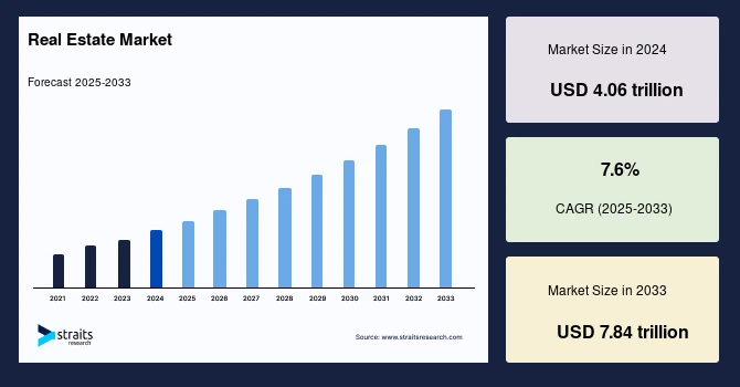 According to StraitsResearch, the global real estate market size is valued at USD 4.06 trillion in 2024 and is estimated to reach USD 7.84 trillion by 2033, growing at a CAGR of 7.6% during 2025-2033.
