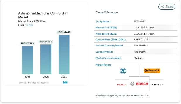 The automotive electronic control unit market size is estimated at USD 109.35 billion in 2026 and is projected to reach USD 144.64 billion by 2031, growing at a CAGR of 5.75% during the forecast period. The report highlights steady automotive electronic control unit market growth supported by regulatory safety requirements, rapid electrification of vehicle fleets, and the transition toward centralized electronic architectures.