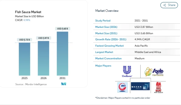 The Fish Sauce Market continues to gain attention as global consumers increasingly explore authentic flavors and simple ingredients in everyday meals. According to industry analysis, the market is valued at USD 2.87 billion in 2026 and is projected to reach USD 3.65 billion by 2031, growing steadily during the forecast period. These numbers reflect the steady acceptance of fermented condiments beyond their traditional Asian base and highlight the influence of culinary globalization. Current fish sauce market trends show the ingredient moving from specialty ethnic stores to mainstream supermarkets and restaurant kitchens worldwide.