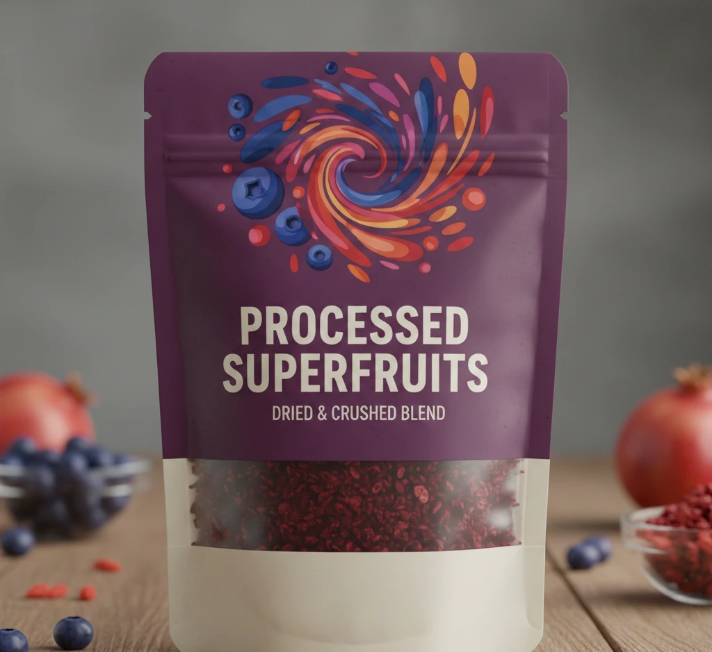 Processed superfruits are nutrient‑dense fruits that undergo preservation techniques such as drying, juicing, freezing, or powdering to create products that capture their nutritional benefits in convenient formats.