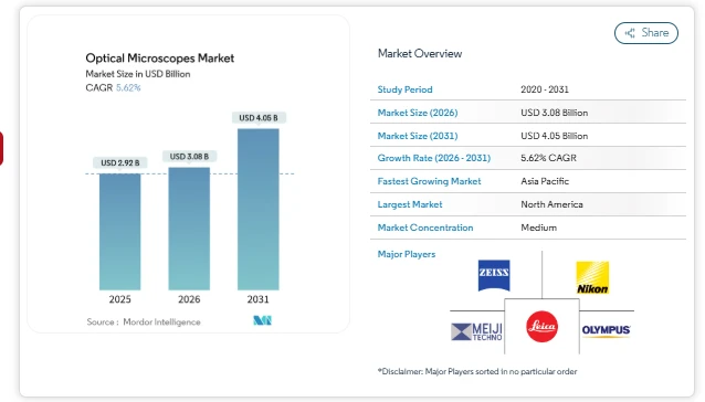 The global optical microscopes market continues to demonstrate steady expansion as research institutions, hospitals, and industrial laboratories increase investment in advanced imaging platforms. According to recent analysis, the optical microscopes market size is projected to grow from USD 2.92 billion in 2025 to USD 3.08 billion in 2026, reaching USD 4.05 billion by 2031, registering a CAGR of 5.62% during 2026–2031. These optical microscopes market growth is supported by increased public funding for life sciences, the adoption of digital imaging systems, and expanding applications in nanotechnology and semiconductor inspection.