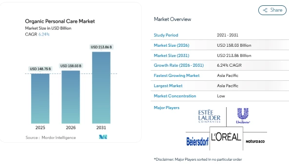 The Organic Personal Care Market Size in 2026 is estimated at USD 158.03 billion, up from USD 148.75 billion in 2025, highlighting strong growth potential in the coming years. The Organic Personal Care Industry encompasses grooming and hygiene products made from natural ingredients without synthetic chemicals, pesticides, or genetically modified organisms (GMOs).