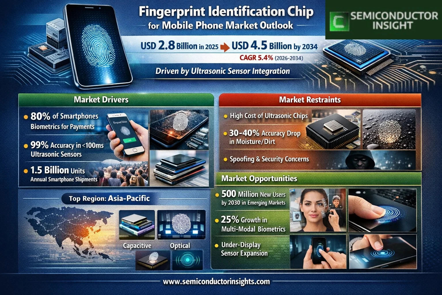 global Fingerprint Identification Chip for Mobile Phone Market was valued at USD 2.8 billion in 2025 and is projected to reach USD 4.5 billion by 2034, reflecting a CAGR of 5.4% during 2026-2034. Market analysis indicates steady expansion driven by biometric security demands in smartphones.