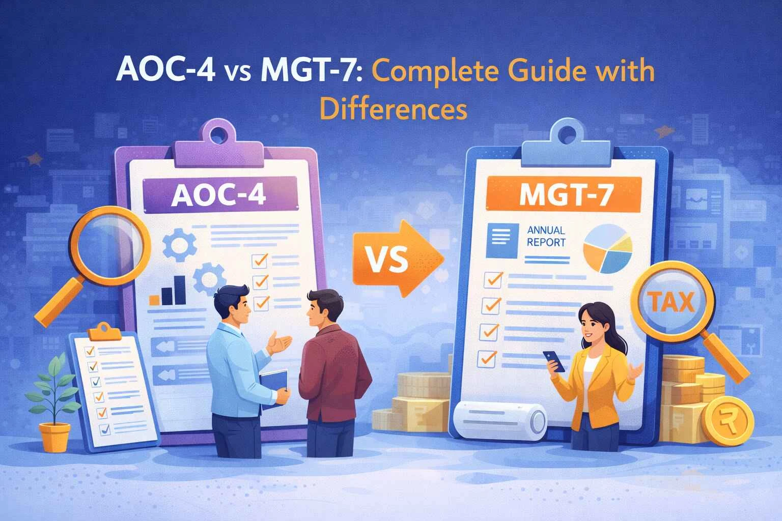 Every company registered under the Companies Act, 2013 carries annual filing obligations that determine its compliance standing. Among these requirements, AOC 4 and MGT 7 stand as the two most significant annual returns filed with the Registrar of Companies. Missing either form, filing incorrectly, or confusing one with the other creates penalties that escalate quickly and affect the company's legal standing. Understanding what is AOC-4 and MGT-7 separately before comparing them prevents common errors that trip up even experienced compliance professionals. These forms serve entirely different purposes, contain different information, attract different signatories, and come with distinct deadlines. Yet they're often confused, lumped together, or treated as interchangeable mistakes that cost companies money and regulatory goodwill. This guide breaks down the difference between AOC-4 and MGT-7 comprehensively, covering purpose, contents, timelines, penalties, and practical filing considerations. Whether you're a company director, practicing company secretary, or compliance officer, the clarity here helps you approach these obligations with confidence.