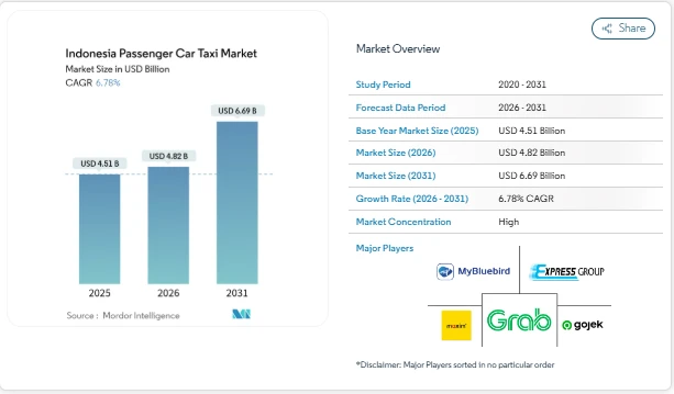 The Indonesia passenger car taxi market continues to expand steadily, reflecting changing travel habits, increasing smartphone usage, and supportive government policies. According to Mordor Intelligence, the indonesia passenger car taxi market size is estimated at USD 4.82 billion in 2026 and is projected to reach USD 6.69 billion by 2031, growing at a CAGR of 6.78% during the forecast period.