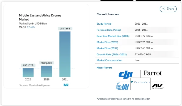 The middle east and africa drones market size is set for strong expansion over the coming years. According to Mordor Intelligence, the market is expected to grow from USD 1.77 billion in 2025 to USD 2.26 billion in 2026 and is forecast to reach USD 7.65 billion by 2031, registering a CAGR of 27.62% during the forecast period. This performance highlights the steady rise in the middle east and africa drones market size across commercial and government applications.