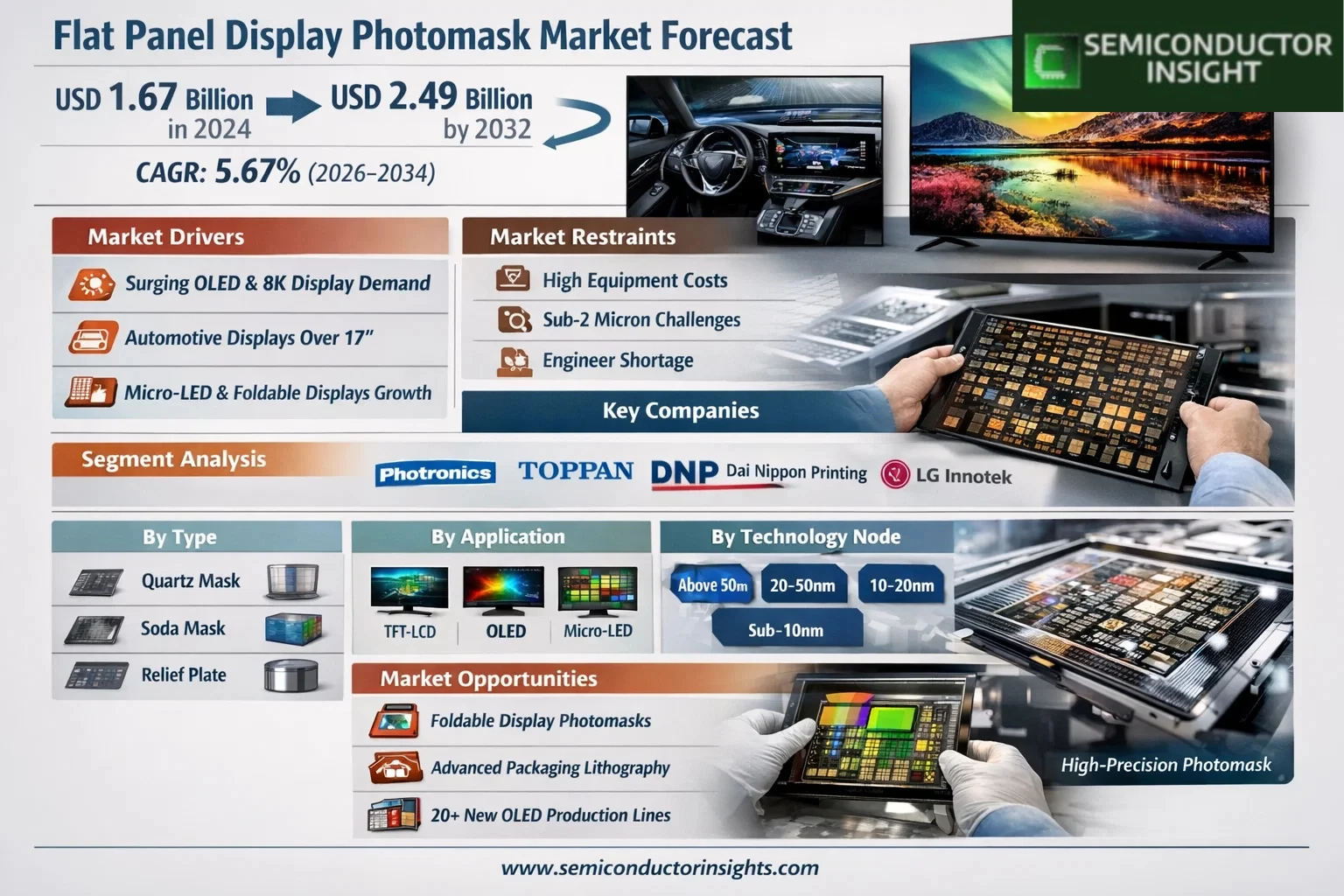 global Flat Panel Display Photomask Market was valued at USD 1.67 billion in 2024 and is projected to reach USD 2.49 billion by 2032, at a CAGR of 5.67% over the forecast period 2026–2034. Growth is anchored by escalating display resolution demands, rapid OLED capacity expansion, and emerging micro-LED architectures requiring next-generation lithographic precision.