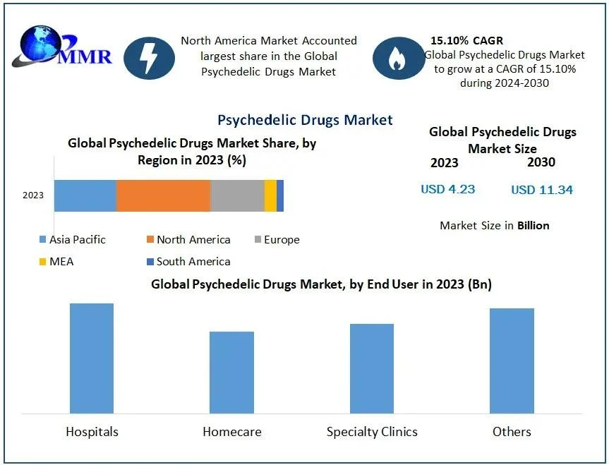 The global Psychedelic Drugs Market Outlook is experiencing a substantial surge, with its valuation reaching US$ 4.23 billion in 2023. Projections indicate a robust compound annual growth rate (CAGR) of 15.10% from 2024 to 2030, aiming for an estimated US$ 11.34 billion by the end of the forecast period.