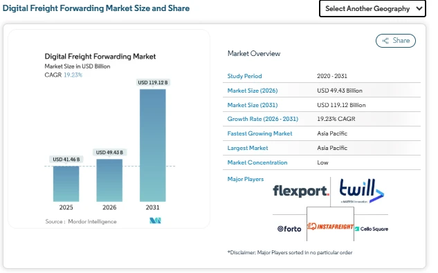 The digital freight forwarding market size is estimated at USD 49.43 billion in 2026, growing from USD 41.46 billion in 2025, and is projected to reach USD 119.12 billion by 2031, expanding at a CAGR of 19.23%. This strong  market growth reflects the rising shift from manual freight booking to integrated, cloud-based logistics platforms. As global trade networks become more interconnected, shippers are demanding unified systems that combine rate discovery, booking, customs documentation, and real-time shipment visibility.
