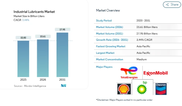 The global Industrial Lubricants Market is steadily growing, with the market size expected to expand from 23.61 billion liters in 2026 to reach 27.95 billion liters by 2031. This growth reflects increasing demand across heavy industries, power generation, and emerging smart manufacturing setups. Industrial lubricants are critical in reducing friction, wear, and energy loss in machinery while also offering heat transfer, corrosion protection, and sealing functions. The industrial sector increasingly relies on these fluids to improve equipment uptime, ensure energy efficiency, and meet environmental compliance requirements.