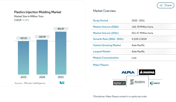 The Plastics Injection Molding Market is witnessing steady growth, with the global market size projected to increase from 163.78 million tons in 2026 to 201.47 million tons by 2031, representing a CAGR of 4.23%. This growth reflects the market’s critical role in producing cost-effective, high-volume components for diverse industries such as packaging, automotive, electronics, and healthcare. Rising e-commerce, expanding electric vehicle (EV) production, and stricter recyclability regulations are driving demand across various sectors.