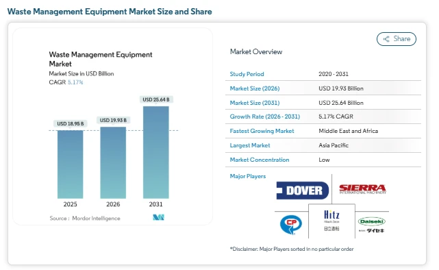 The waste management equipment market was valued at USD 18.95 billion in 2025 and is estimated to grow from USD 19.93 billion in 2026 to reach USD 25.64 billion by 2031, registering a CAGR of 5.17% during 2026–2031. The steady rise in municipal solid waste volumes, landfill diversion mandates, and increased spending on recycling facilities are shaping the forecast across major regions.