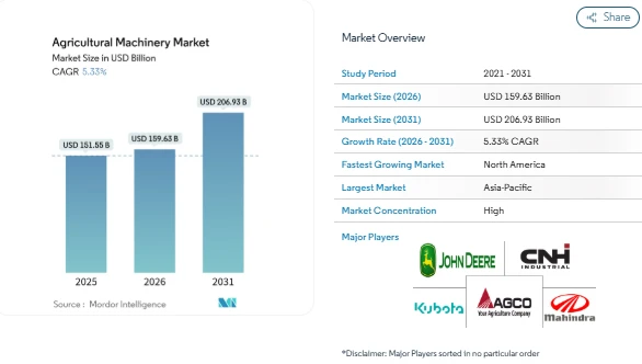 The Agricultural Machinery Market    has emerged as a critical sector driving efficiency and productivity in the global farming landscape. Valued at USD 151.55 billion in 2025, the market is projected to grow from USD 159.63 billion in 2026 to reach USD 206.93 billion by 2031, registering a CAGR of 5.33% during the forecast period. The growth of this market is fueled by increasing demand for mechanized solutions to address labor shortages, optimize farm yields, and adopt precision agriculture practices.