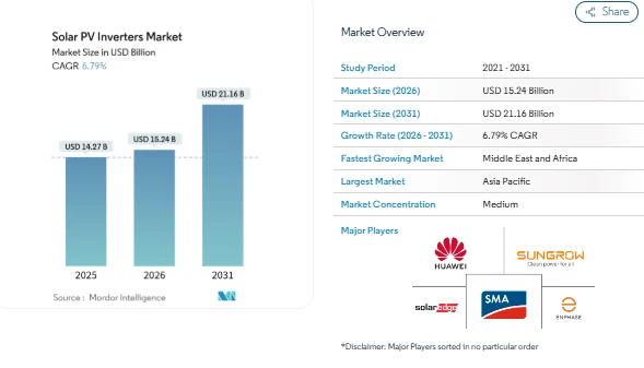 The Solar PV Inverter Market is a critical segment of the renewable energy ecosystem, bridging the gap between photovoltaic (PV) panels and the electrical grid by converting direct current (DC) from solar panels into alternating current (AC) suitable for end-use. According to recent industry insights, the global solar PV inverter market size is expected to grow from USD 15.24 billion in 2026 to USD 21.16 billion by 2031, reflecting a compound annual growth rate (CAGR) of approximately 6.79% over the forecast period. This growth is driven by increasing investments in solar energy projects, government mandates for rooftop solar installations, and a transition toward smarter grid-integrated inverter solutions.