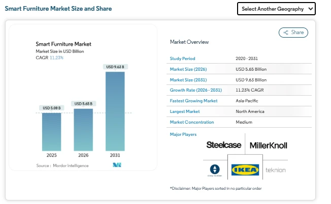 The smart furniture market was valued at USD 5.08 billion in 2025 and is estimated to grow from USD 5.65 billion in 2026 to reach USD 9.63 billion by 2031, registering a CAGR of 11.23% during the forecast period. The market size is expanding as connected living spaces, flexible workplaces, and integrated wellness features become part of everyday expectations. Rising adoption of IoT platforms, better interoperability standards, and falling sensor costs are supporting the smart furniture market forecast. At the same time, data privacy and upfront pricing remain important considerations for buyers.