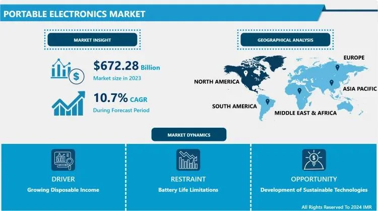 Portable Electronics Market Size Was Valued at USD 672.28 Billion in 2023, and is Projected to Reach USD 1678.34 Billion by 2032, Growing at a CAGR of 10.7% From 2024-2032.