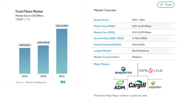 The Food Fibers Market is experiencing steady growth as consumer focus on digestive health and metabolic wellness increases. The global market is projected to grow from USD 10.04 billion in 2026 to USD 15.99 billion by 2031, reflecting a CAGR of 9.75%. Soluble fibers account for the largest market share, valued at 59.21% in 2025, driven by their prebiotic benefits and role as sugar substitutes in food and beverage applications.