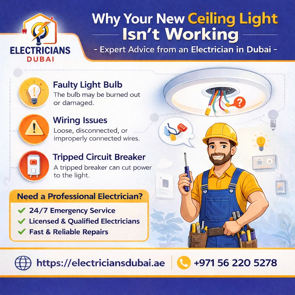 As a trusted Electrician In Dubai, we see this issue almost every week. At Electricians Dubai, we help homeowners and business owners fix lighting problems quickly and safely. This blog will describe the reasons your new ceiling light has not been turned on, what self-checks you can do and when you need a professional Electrician In Dubai.