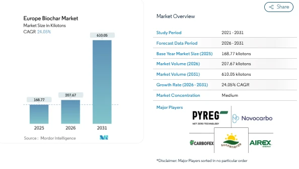 The Europe Biochar Market is experiencing a rapid surge, with its size estimated to grow from 207.67 kilotons in 2026 to 610.05 kilotons by 2031. This represents a compound annual growth rate of 24.05% over the forecast period. The market growth is driven by increasing adoption across agriculture, animal farming, and industrial applications, supported by policy incentives and carbon-credit initiatives.