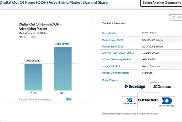 The digital out-of-home advertising market size reached USD 20.22 billion in 2026 and, according to the market forecast, is projected to grow at a CAGR of 10.28% to reach USD 32.98 billion by 2031. The digital out of industry is gaining wider acceptance as advertisers shift budgets toward measurable and dynamic outdoor formats.