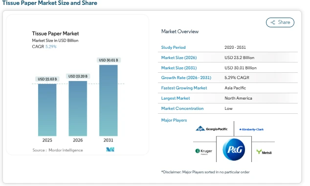 The tissue paper market continues to witness steady demand as hygiene awareness, urban living patterns, and institutional sanitation practices expand worldwide. According to industry analysis, the tissue paper market size was valued at USD 22.03 billion in 2025 and is estimated to grow to USD 23.2 billion in 2026, eventually reaching USD 30.01 billion by 2031, reflecting a CAGR of 5.29% during 2026-2031. This upward trajectory in the market forecast highlights the role of hygiene products in daily household and commercial operations. Demand across households, offices, hotels, healthcare facilities, and public infrastructure is reinforcing long-term market growth. The industry has also shown resilience despite rising fiber and energy costs. Large integrated mills have invested heavily in capacity additions and modernization projects, which indicates confidence in sustained consumption.