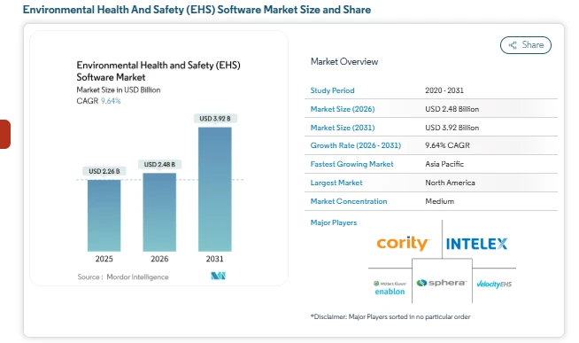 The environmental health and safety software market size was valued at USD 2.26 billion in 2025 and is estimated to grow to USD 2.48 billion in 2026, eventually reaching USD 3.92 billion by 2031, registering a CAGR of 9.64% during the forecast period. This steady expansion reflects the increasing need for digital tools that help organizations monitor workplace risks, manage environmental data, and meet strict compliance standards across industries. Companies are gradually shifting from manual record-keeping and spreadsheets to centralized digital platforms. This shift is contributing to notable market growth, as organizations aim to manage audits, safety incidents, inspections, and environmental performance through integrated software platforms. Businesses now treat these systems as operational management tools rather than simple compliance applications.