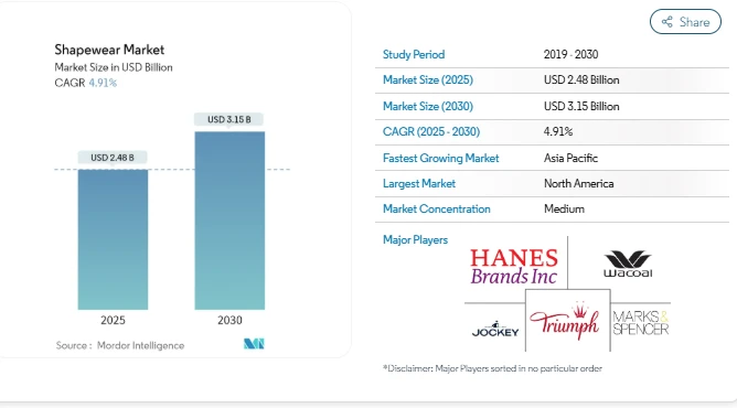 The Shapewear Market has gained steady attention in the global apparel sector as consumers increasingly look for garments that combine comfort, confidence, and body contouring. According to industry analysis, the Shapewear Market Size is estimated at USD 2.48 billion and is expected to reach USD 3.15 billion by 2030, registering a CAGR of 4.91% during the forecast period. This growth highlights how shapewear has moved beyond its traditional role as a niche innerwear category to become a widely accepted fashion solution for everyday wear.