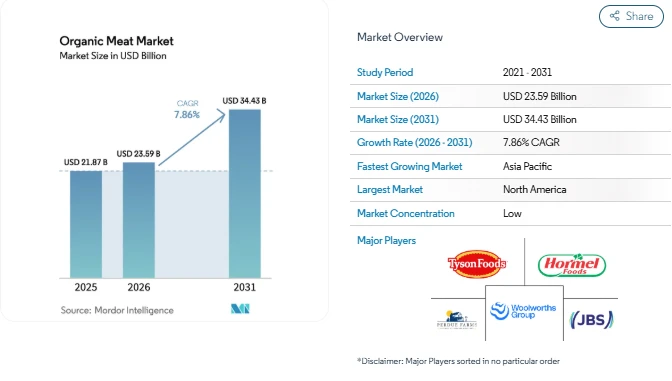 The Organic Meat Market is witnessing steady expansion as consumers increasingly seek food products that align with health awareness, transparency in sourcing, and ethical livestock practices. According to industry analysis, the Organic Meat Market Size was valued at USD 21.87 billion in 2025 and is projected to grow from USD 23.59 billion in 2026 to USD 34.43 billion by 2031, reflecting a CAGR of 7.86% during the forecast period.