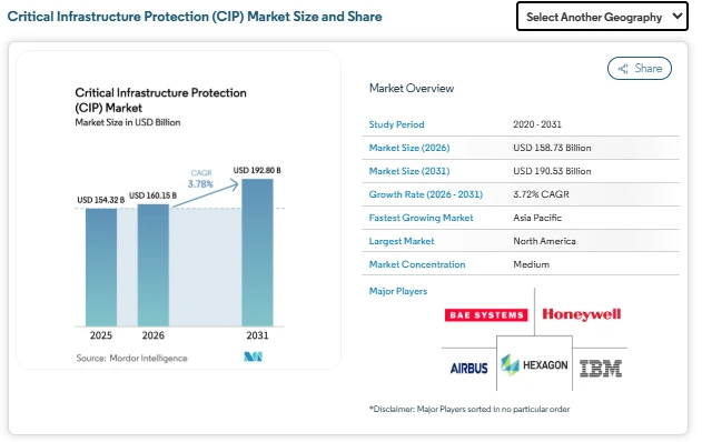 The critical infrastructure protection market size is projected to grow from USD 150.62 billion in 2025 to USD 158.73 billion in 2026 and is expected to reach USD 190.53 billion by 2031, registering a CAGR of 3.72% during the forecast period. The rising importance of protecting essential national systems such as energy grids, transportation networks, communication infrastructure, and water facilities is creating steady demand across the critical infrastructure protection industry. Governments and private operators are increasing investments in monitoring, cybersecurity, and physical protection to prevent disruptions that could affect public safety and economic stability.