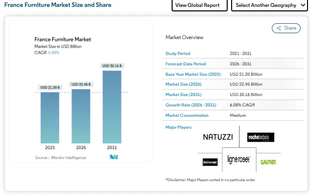 The France furniture market size was valued at USD 21.20 billion in 2025 and is estimated to grow to USD 22.45 billion in 2026, reaching USD 30.16 billion by 2031, at a CAGR of 6.08% during the forecast period (2026–2031). This steady expansion reflects consistent consumer demand, renovation activities, and growing attention to sustainability across residential and commercial spaces. The market growth is supported by structured retail networks, product transparency, and demand for modern home interiors that combine functionality with environmental responsibility.