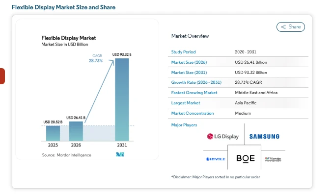 The flexible display market size was valued at USD 20.52 billion in 2025 and is estimated to grow from USD 26.41 billion in 2026 to reach USD 93.32 billion by 2031, expanding at a CAGR of 28.73% during the forecast period (2026-2031). reflects rising demand for foldable smartphones, wearable .devices, next-generation televisions, and advanced digital interfaces across multiple industries.