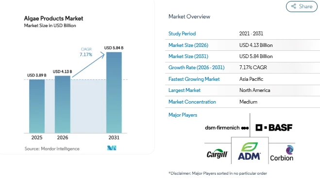 The Algae Products Market is gaining attention across several industries as manufacturers increasingly look for natural, sustainable, and traceable ingredients. According to market analysis, the Algae Products Market Size is expected to grow from USD 4.13 billion in 2026 to USD 5.84 billion by 2031, registering a CAGR of 7.17% during the forecast period. The market expansion is closely tied to growing consumer demand for plant-based nutrition, clean-label food ingredients, and marine-derived compounds used in cosmetics and health products.