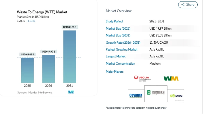 The global Waste To Energy (WTE) Market is witnessing steady growth, with market size expected to increase from USD 45.42 billion in 2025 to USD 49.97 billion in 2026. The market is projected to reach USD 85.35 billion by 2031, growing at a CAGR of 11.3% over the forecast period.  Additionally, utilities and independent power producers are increasingly exploring long-term off-take agreements for biofuels, which mitigate merchant-price risks and strengthen the overall Waste To Energy (WTE) Market Forecast.