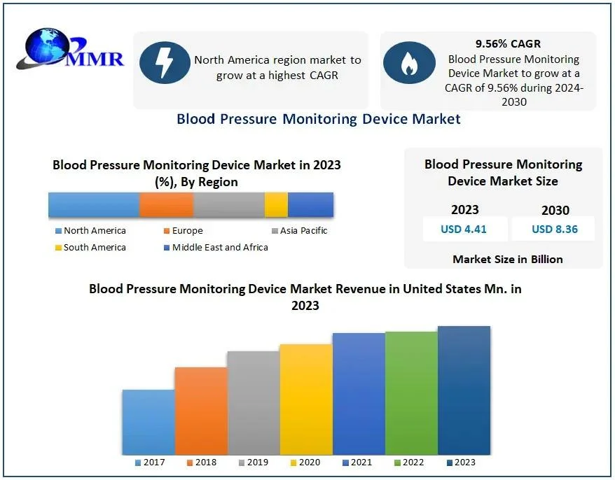 The global Blood Pressure Monitoring Device Market Growth is experiencing significant growth, with projections indicating an increase from USD 4.41 billion in 2023 to approximately USD 8.36 billion by 2030, reflecting a Compound Annual Growth Rate (CAGR) of 9.56% during the forecast period. Blood pressure monitoring devices, commonly known as sphygmomanometers, are essential instruments used to measure blood pressure. These devices consist of an air-filled cuff placed around the arm at heart level, which measures two types of pressure: systolic and diastolic. Accurate monitoring of blood pressure is crucial for the early detection and management of hypertension, a primary risk factor for chronic heart diseases and strokes.