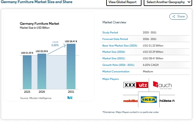 The Germany furniture market size in 2026 is estimated at USD 22.29 billion, rising from USD 21.22 billion in 2025 and projected to reach USD 28.47 billion by 2031, registering a CAGR of 5.02% during 2026–2031. The Germany furniture industry is currently navigating a period of cautious demand as consumers adjust spending due to inflation and higher living costs. This environment has led to softer sales across several categories, particularly in mid-range and economy segments, where discretionary purchases are more sensitive to household budgets.