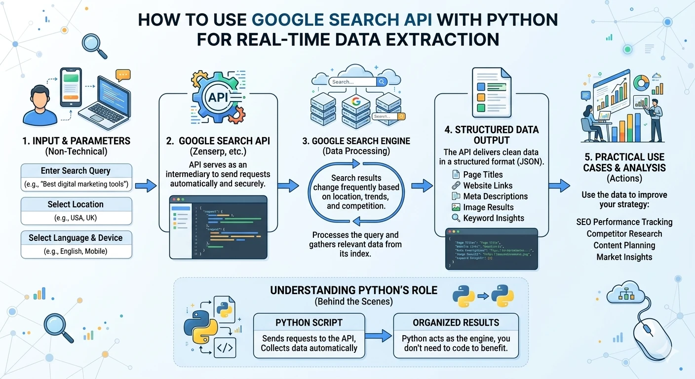 This guide explains how to use a Google Search API with Python for real-time data extraction in a simple and practical way. The focus is on helping you understand the process clearly, even if you are not from a technical background.