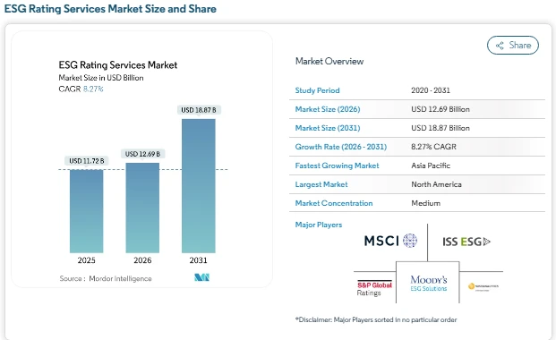The ESG rating services market size was valued at USD 11.72 billion in 2025 and is estimated at USD 12.69 billion in 2026, with the market forecast indicating it will reach USD 18.87 billion by 2031, growing at a CAGR of 8.27% during the forecast period. This trajectory highlights steady market growth supported by compliance-driven demand, expanding disclosure frameworks, and rising investor scrutiny. Across the ESG rating services industry, institutions are moving away from narrative sustainability reporting toward structured, measurable disclosures. Regulatory bodies worldwide are mandating standardized reporting formats, which increases the need for reliable ratings, datasets, analytics, and verification tools.