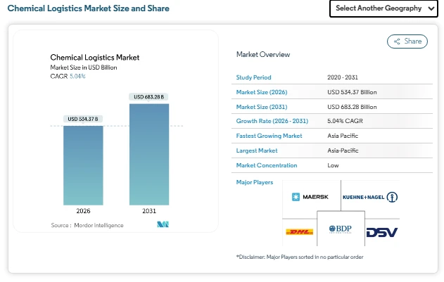 The chemical logistics market size is estimated at USD 534.37 billion in 2026 and is projected to reach USD 683.28 billion by 2031, registering a CAGR of 5.04% during 2026–2031. This market forecast reflects rising demand from manufacturing hubs, pharmaceutical supply chains, and specialty chemical producers that rely on secure, compliant movement of materials. Growth in the Chemical logistics industry is supported by the expansion of chemical output in emerging economies and the need for reliable distribution networks in mature markets. As production locations diversify, companies require logistics partners capable of handling complex regulations, hazardous classifications, and temperature-sensitive cargo. These factors are strengthening the market share of providers offering integrated services across transport, warehousing, and inventory management.