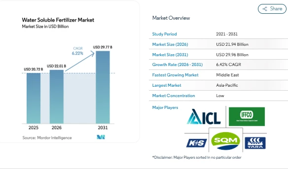 The Water Soluble Fertilizer Market is witnessing steady development as agriculture moves toward efficient nutrient management and improved irrigation practices. According to industry analysis, the Water Soluble Fertilizer Market Size was valued at USD 20.72 billion in 2025 and is estimated to grow from USD 21.94 billion in 2026 to USD 29.96 billion by 2031, registering a CAGR of 6.42% during the forecast period. This Water Soluble Fertilizer Market Forecast reflects the increasing use of fertilizers that dissolve completely in water and deliver nutrients directly through irrigation systems.
