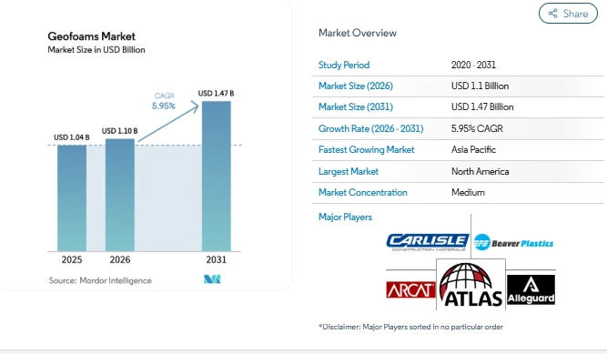 The Geofoams Market is projected to grow steadily, with the market size expected to increase from USD 1.10 billion in 2026 to USD 1.47 billion by 2031, at a CAGR of 5.95%. Geofoam, a lightweight cellular material primarily made from expanded polystyrene (EPS) or extruded polystyrene (XPS), is widely used in roadway embankments, building foundations, and other civil engineering applications.