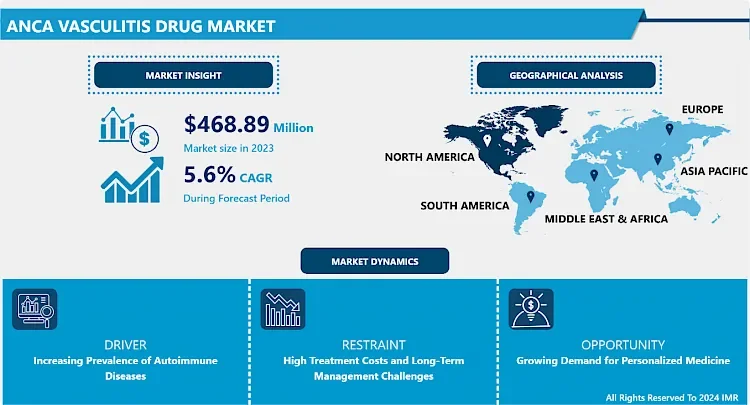 ANCA Vasculitis Drug Market Size was valued at USD 468.89 Million in 2023, and is Projected to Reach USD 765.68 Million by 2032, Growing at a CAGR of 5.6% From 2024-2032.