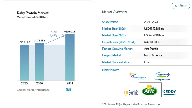 The Dairy Proteins Market is witnessing steady expansion as consumers increasingly focus on protein-rich diets and functional nutrition. According to Mordor Intelligence, the Dairy Proteins Market Size was valued at USD 5.17 billion in 2025 and is estimated to reach USD 5.41 billion in 2026, eventually growing to USD 6.72 billion by 2031, registering a CAGR of 4.47% during the Dairy Proteins Market Forecast period (2026–2031).