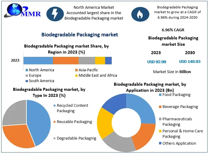 Biodegradable packaging refers to materials that naturally decompose and disintegrate under environmental conditions within a reasonable timeframe. These materials can be broken down by microorganisms such as bacteria, fungi, and algae. Common types of biodegradable packaging include cardboard, paper, and bio-based polymers derived from plant-based materials like cornstarch, mushrooms, and seaweed. The global biodegradable packaging market was valued at USD 92.99 billion in 2023 and is projected to reach USD 148.93 billion by 2030, registering a compound annual growth rate (CAGR) of 6.96% during the forecast period.
