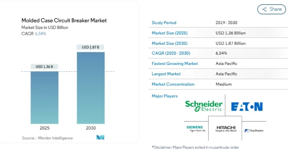 The Molded Case Circuit Breakers (MCCBs) market is witnessing steady growth, driven by the rising demand for reliable electrical protection across residential, commercial, and industrial sectors. The global Molded Case Circuit Breakers Market size is estimated at USD 1.36 billion in 2025 and is projected to reach USD 1.87 billion by 2030, registering a CAGR of 6.54% during the forecast period. By 2026, the market is expected to continue its upward trajectory, fueled by increasing infrastructure development, expansion of transmission and distribution networks, and industrial growth, especially in Asia-Pacific.