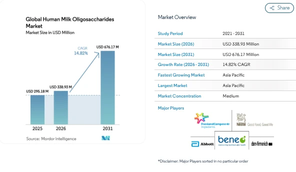 The Human Milk Oligosaccharides (HMO) Market is gaining strong attention as demand rises for advanced infant nutrition products that closely resemble human breast milk. According to Mordor Intelligence, the Human Milk Oligosaccharides (HMO) Market Size is estimated at USD 338.93 million in 2026 and is projected to reach USD 676.17 million by 2031, growing at a CAGR of 14.82% during the forecast period.