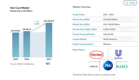 The global Hair Care Market is witnessing consistent growth, with the market size projected to reach USD 108.59 billion by 2031, growing from an estimated USD 82.5 billion in 2026 at a CAGR of 5.69%. The growth is fueled by increasing consumer awareness about product ingredients, the rising popularity of at-home salon-quality routines, and expanding interest in preventive hair wellness. Premium hair care products, scalp health treatments, and protective formulations are becoming central to consumer purchases.