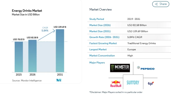 The global Energy Drinks Market is expected to reach USD 109.69 billion by 2031, growing from USD 82.58 billion in 2026 at a CAGR of 5.84%. This growth is driven by changing consumer preferences toward functional beverages, natural ingredients, and convenient packaging. With increasing urbanization, busy lifestyles, and rising disposable incomes, consumers are seeking energy-boosting drinks that not only stimulate alertness but also provide added wellness benefits.