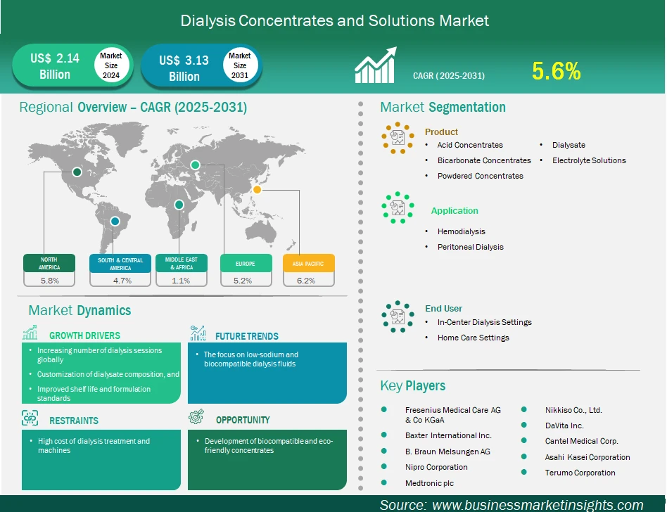 The Dialysis Concentrates and Solutions Market regional landscape, as captured in this Dialysis Concentrates and Solutions Market Regional analysis, reveals distinct and well-differentiated demand profiles across five major geographies, each contributing uniquely to the market's projected expansion from US$ 2,191.16 million in 2024 to US$ 3,127.94 million by 2031.